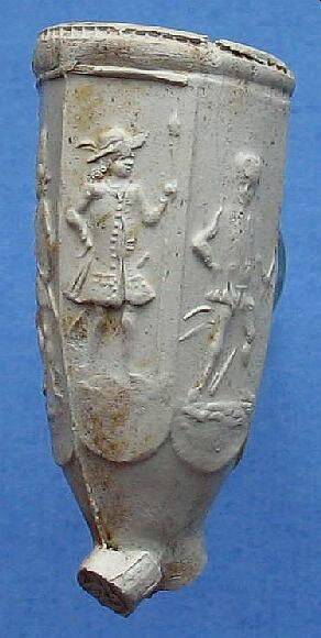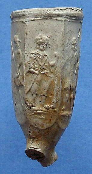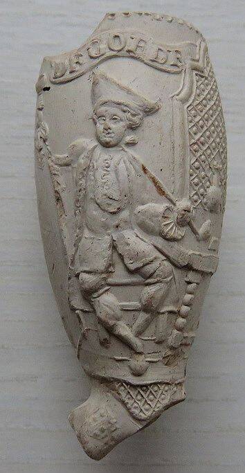 Zeskantige Goudse 18e eeuwse pijpenkop met de voorstelling van soldaten