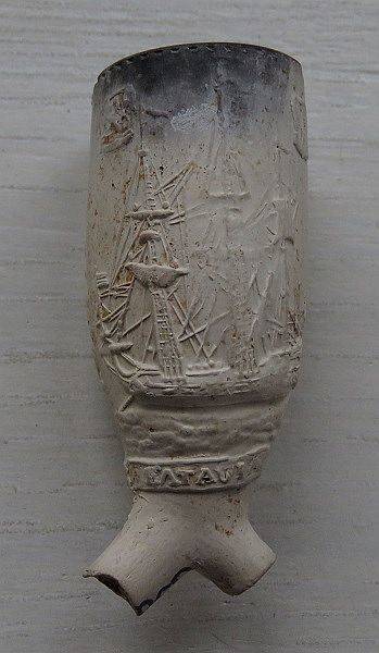 Een 18e eeuwse kleipijp (part verz) die gewijd is aan het overzeese Oost-Indië. Aan de ene zijde van de pijp een zeilschip, een driemaster. Aan de andere zijde een schild met een zwaard. Boven het zeilschip zien we de wapens van Zeeland en Delft, plaatsen met een Kamer van de VOC. Aan de onderzijde van de pijp op een lint staat de tekst WELKOM OP BATAVIA. Het hielmerk is de bot, een Goudse merk gezet door de Goudse pijpenmaker Pieter (de jonge) Lens (1747-1782). Van deze kleipijp is bekend dat hij ook door andere Goudse pijpenmakers is gemaakt met o.a. het hielmerk de gekroonde 41, de gekroonde P en zoals hieronder het zwijn. Vindplaats Reeuwijk.