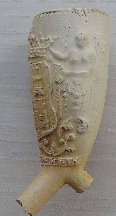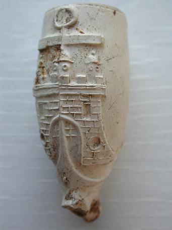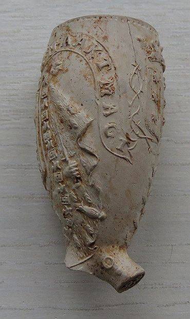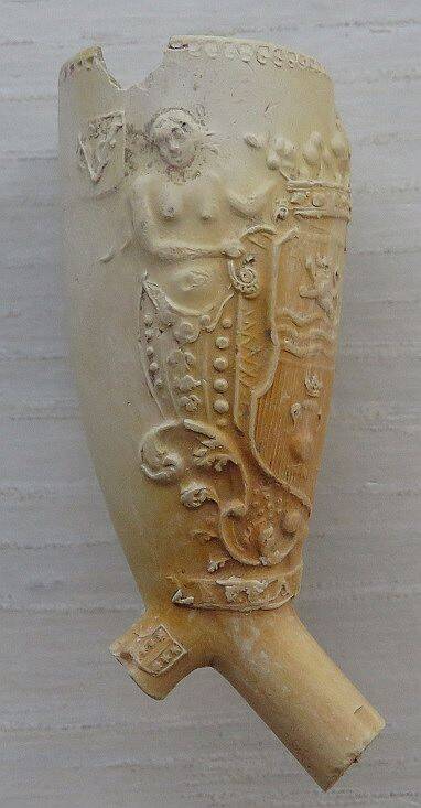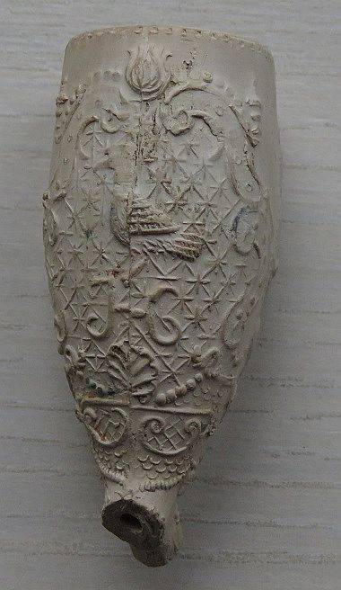 18e eeuwse kleipijp (ds26FM208), exportpijp voor de stad Hamburg met het wapen van Hamburg op de pijp. Deze exportpijp is gemaakt door een Goudse pijpenmaker. Hielmerk Pijprokende man dan wel een trompettist. Vindplaats: langs Gouwe bij Waddinxveen.