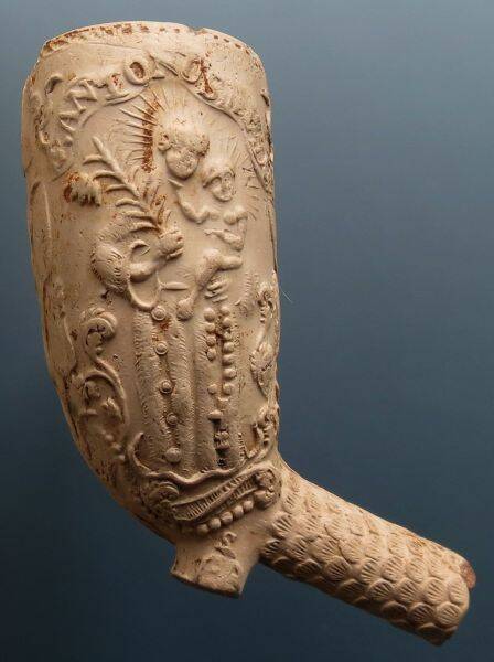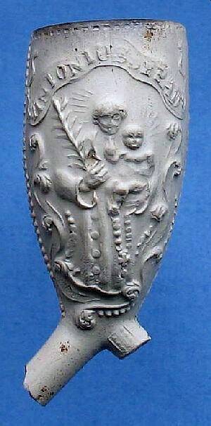 Kleipijp (AK) met de voorstelling van Anthonius van Padua met kind op arm en lauwertak.