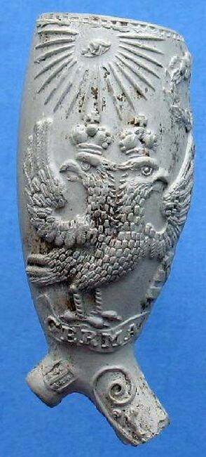 18e eeuwse en 19e eeuwse Goudse pijpenkop (DsPR9FM). Het gaat om precies dezelfde mal maar de kleipijp is met 100 jaar verschil door twee verschillende Goudse pijpenmakers uitgebracht. Aan de ene kant een enkele adelaar en aan de andere kant een dubbele adelaar. Op een lint de tekst Germaniae Pax. Verder wordt een overwinningskrans vastgehouden en staat een zon afgebeeld.