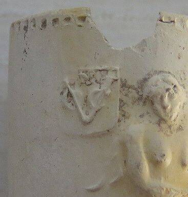 Naast het gezicht van de twee halfvrouwen zien we de wapenschilden