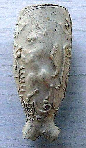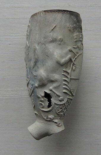 Nog eenzelfde 18e eeuwse pijpenkop (PB3729) als boven met aan de ene kant een eenhoorn en aan de andere kant een leeuw.