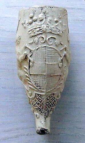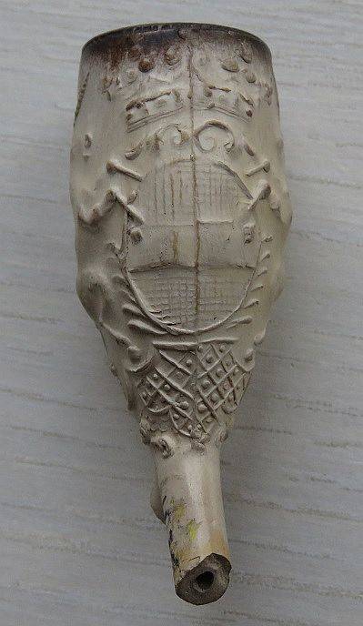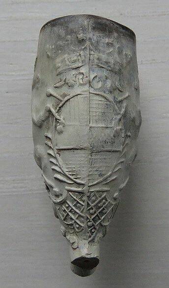 wapenschild vast waarop verschillende wapens zijn te onderscheiden. Onder op de pijpenkop een lint