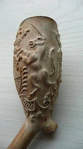 Het fabeldier eenhoorn wordt in de cryptozoölogie beschreven als een soort wild paard. Met op zijn voorhoofd een spiraalvormige hoorn, gedraaid en uitlopend in een punt. Met gespleten hoeven, een staart als van een leeuw en een geitensik (de eenhoorn op de 19e eeuwse pijpenkop staat met sik afgebeeld). Al 400 jaar voor Christus aan het hof van de Perzische koning werd de eenhoorn al beschreven door de historicus Ctesias. In de Middeleeuwen werd een eenhoorn aangeduid als een sterk en woest beest maar tegelijkertijd geassocieerd met kuisheid en maagdelijkheid. Een eenhoorn kon alleen in bedwang gehouden worden door een maagd. Inmiddels weten we dat met de hoorn van het fabeldier eenhoorn de slagtand van de narwal bedoeld wordt, een dolfijnachtige die zijn lange slagtand gebruikt als gevoelig tastorgaan.