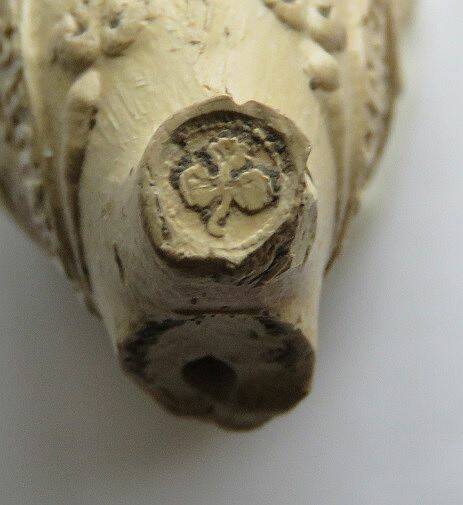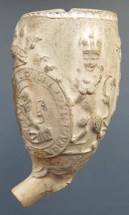met de tekst JE MAINTIENDRAI. Het hielmerk op deze pijpenkop is de gekroonde L. De maker van de kleipijp