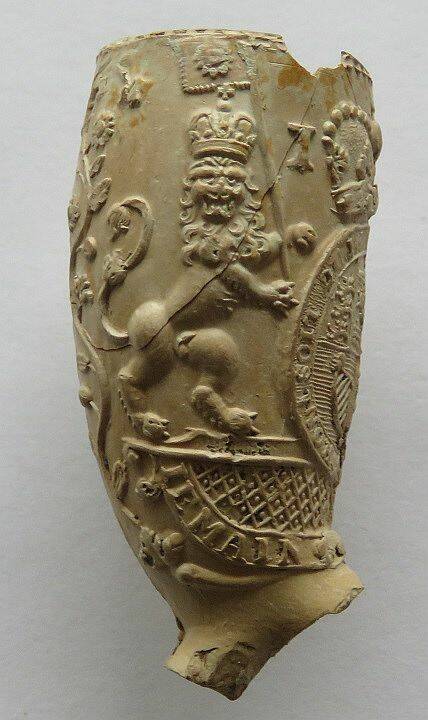 Kleipijp (Lade18FM1309) met aan de rokerskant het wapenschild van het huis van Hannover vastgehouden door een
