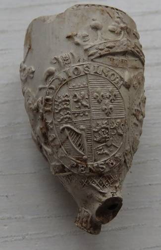Kleipijp (lade23FM1466) met aan een kant bloemetjes en aan de andere kant onder een kroon in een cirkel het Engelse wapenschild vastgehouden door een leeuw en eenhoorn met rondom de tekst HONI SOIT QUI MAL Y PENSE. Onder in een lint: DIEU ET MON DROIT wat betekent God en mijn recht. Hielmerk: geen. 2e helft 19e eeuw. Pijpenmaker: onbekend. Vindplaats: Gouda polder Achterwillens.