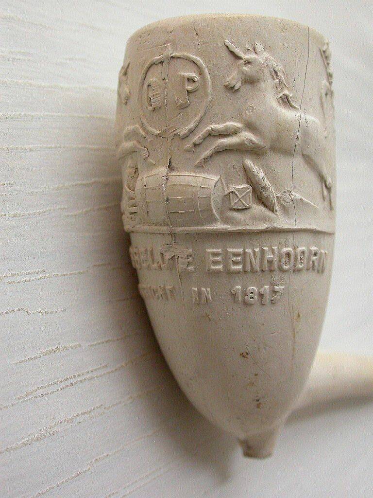 Fantastisch scherp uitgevoerde 18e eeuwse pijpenkop (part verz) met aan twee kanten een eenhoorn. Ze houden een wapenschild vast waarop het wapen van Borsele staat. Aan de achterkant van de pijpenkop staan ook wapens in een schild, dat van Zeeland, Middelburg, Vlissingen en Zierikzee met eronder een lint met de tekst ZEELANDIA. Het hielmerk op deze pijpenkop is de gekroonde AP. De maker van de kleipijp was de Goudse pijpenmaker Teunis Bremmert (1762-1773).