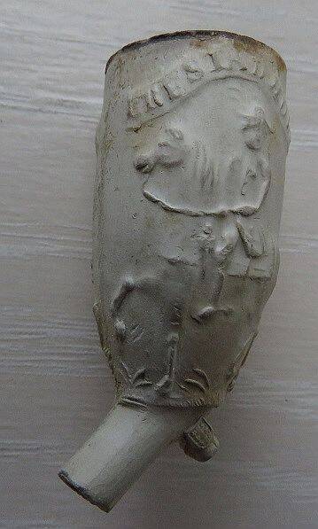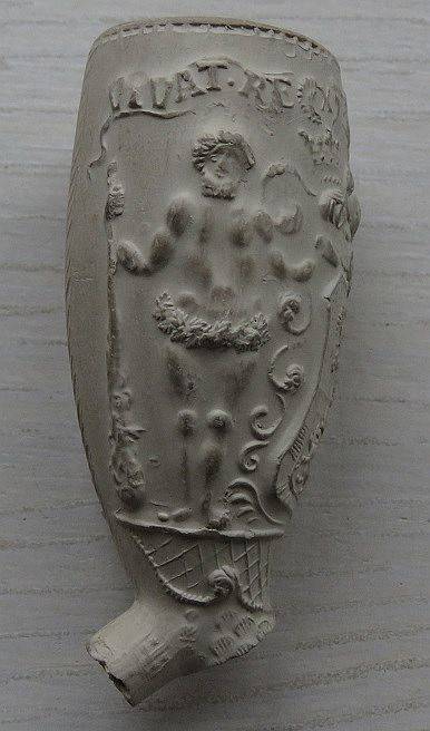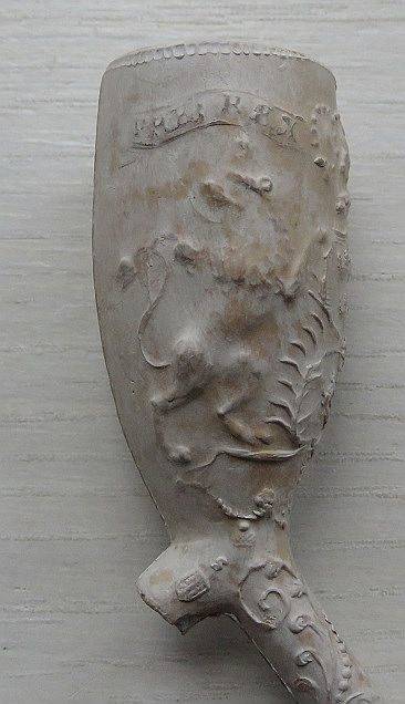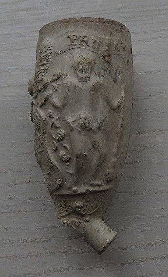 Kleipijp 19e eeuw (lade1FM geen nummer) met aan weerszijden van een wapenschild wildemannen. Met op een lint de tekst: VIVAT DE PRUIJSE. Hielmerk melkmeisje van de Goudse pijpenmaker Jan Prince (1833-1898).