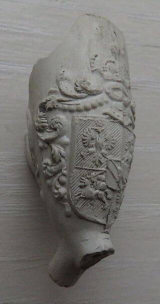 18e eeuwse kleipijp (ds26FM1551) met de voorstelling van Wapen van Polen en Litouwen / Wapen van de keurvorsten van Saksen. Hielmerk: zwijn. Goudse pijpenmaker Lieve Pijl (1740-1770). Vindplaats: onbekend.