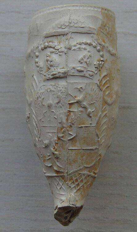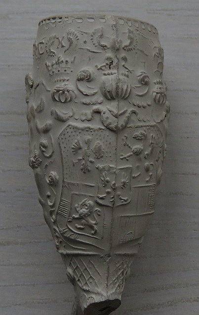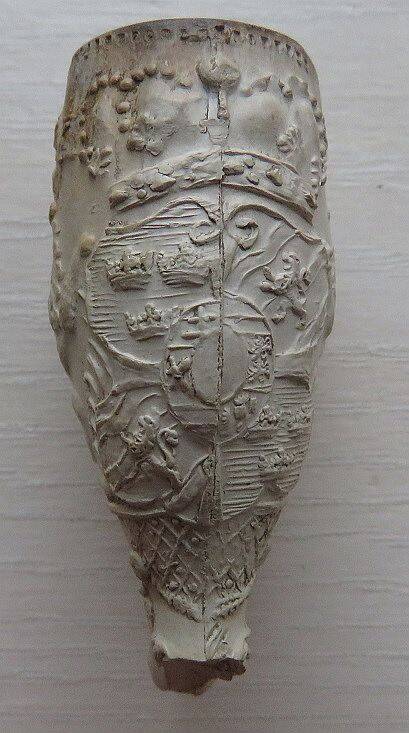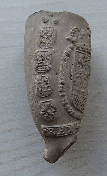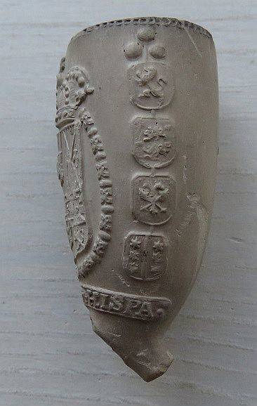Kleipijp (ds26FM1330) met rondom een wapenschild de wapens van de zeven Provinciën en het stadswapen van Gouda. Op het wapenschild ook nog diverse wapens. Aan de voet van de pijp een lint met de tekst: REX HISPA. Maker onbekend, hielmerk onleesbaar. Vindplaats Boskoop tuinderijen.