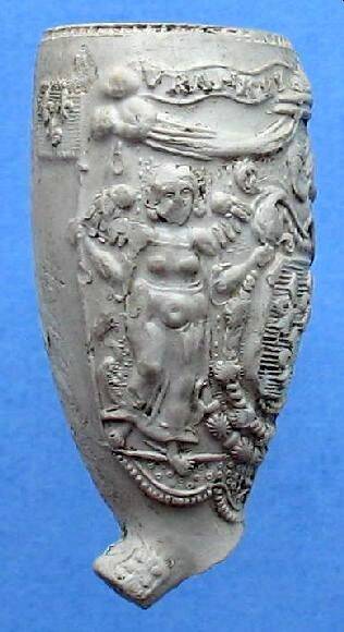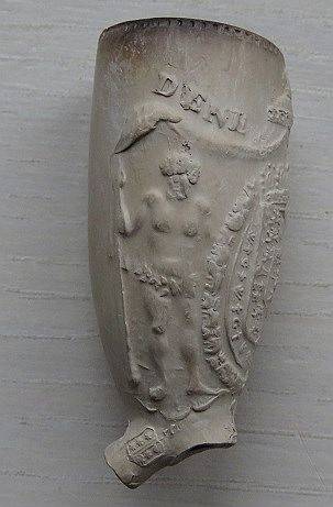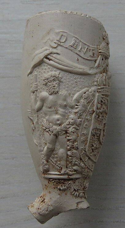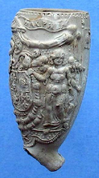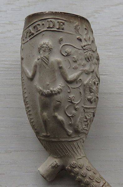 Eind 18e eeuwse kleipijp (ds30FM1350) met twee wildemannen met knotsen en in het midden een wapenschild met kroon en verschillende wapens. Aan de bovenkant de tekst DENEMARKE. Als hielmerk de L van de Goudse pijpmaker Frans Verzijl. 1750-1780. Bodemvondst poldergebied rond Gouda.