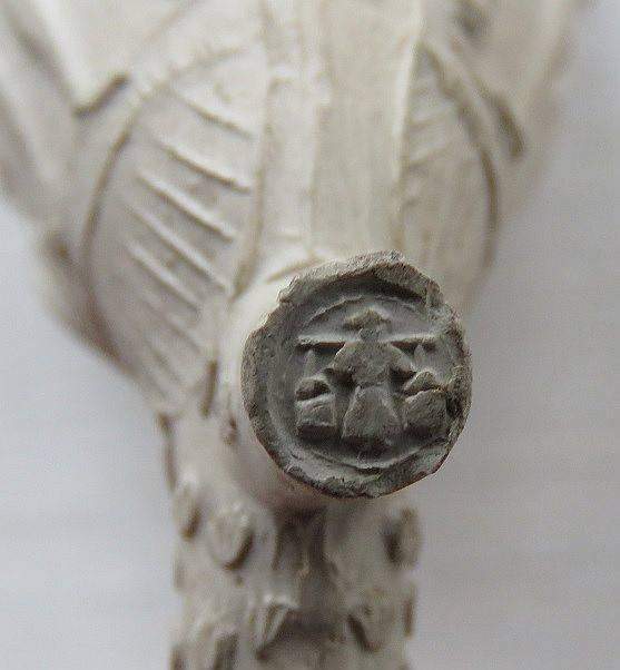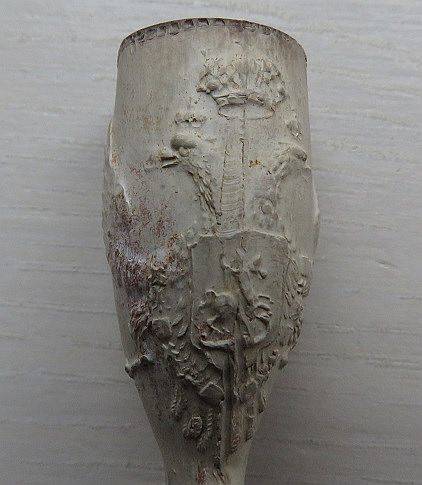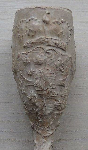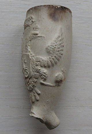 18e eeuwse kleipijp (ds30FM644) met de voorstelling van dubbelkoppige gekroonde adelaars met scepter en rijksappel