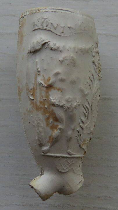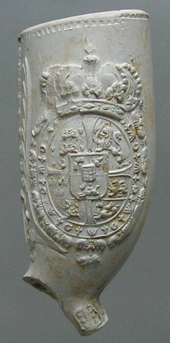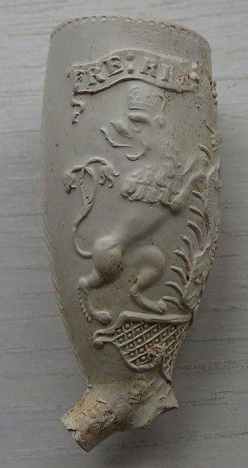18e eeuwse kleipijp (ds30FM887) met twee wildemannen met knotsen en in het midden een wapenschild met kroon en verschillende wapens. Aan de bovenkant de tekst KONING:V PRUYSE. Als hielmerk de molen van de Goudse pijpmaker Jan Jacobsz Danens (1768-1782). Vindplaats/Zevenhuizen.