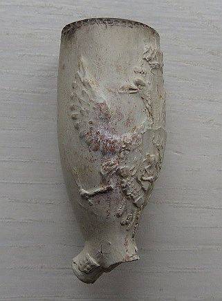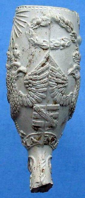 Kleipijp (Ds28FM461 met een dubbele en enkele adelaar. In een lint een onduidelijke tekst met de woorden: ZWEIER ADLER FRIEDE. De steel is aan een kant op een bijzondere manier versierd.