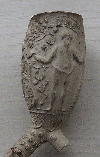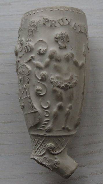 Of deze kleipijp wel 18e eeuw is is onduidelijk . Met aan weerszijden wildemannen rond een wapenschild en op een lint de tekst: VIVAT DE PRUIJSE. Hielmerk melkmeisje van de Goudse pijpenmaker Cornelis Prince (1773-1834) of Jan Prince (1833-1898). Vindplaats: niet bekend.