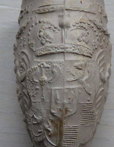 het stadswapen van Gouda. Op het wapenschild ook nog diverse wapens. Aan de voet van de pijp een lint met