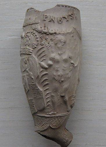 18e eeuwse kleipijp (Ds39FMgeennummer) met twee wildemannen met knotsen en in het midden een wapenschild met kroon en verschillende wapens. Aan de bovenkant de tekst KONING:V PRUYSE. Als hielmerk 30 onder een kroon van de Goudse pijpmaker Jan Sluijter en opvolgend zijn weduwe (1760-1785). Vindplaats: Gouda.