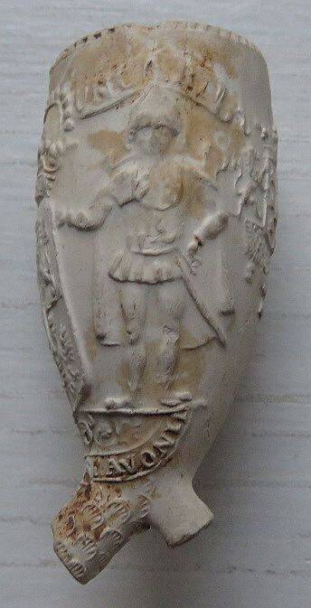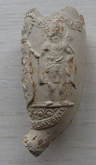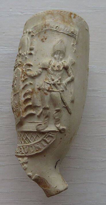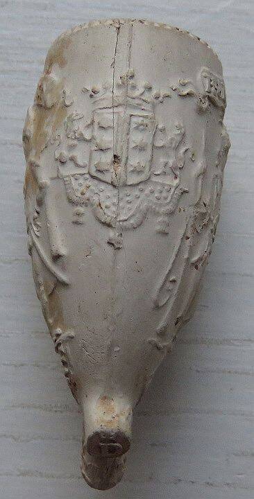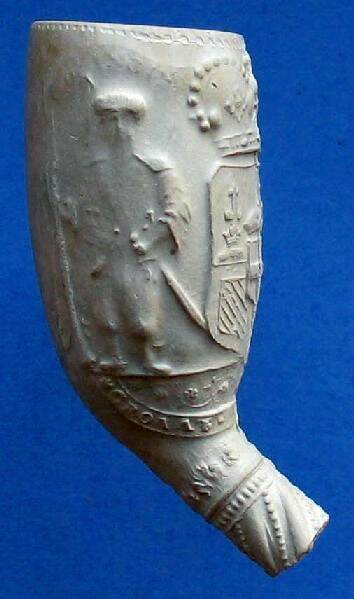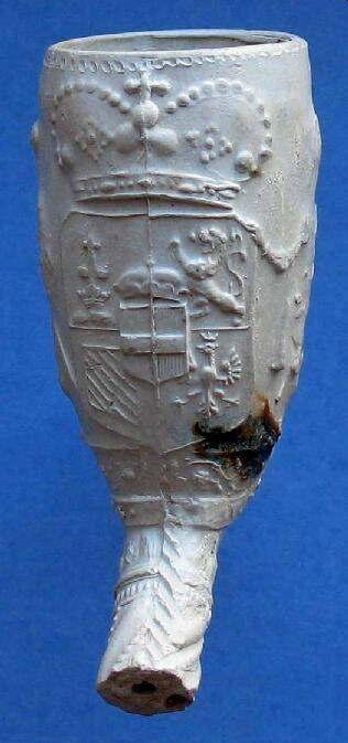 Weer een andere 18e eeuwse exportpijp (ds26FM473) met de voorstelling van personen rondom wapens. Op de top van de pijp een lint met de tekst: KONING VAN HONGAR. Onder op de pijp de tekst CROAAT en SLAVONIE. Op de achterzijde van de pijp het wapen van Gouda. Ca. 1760.