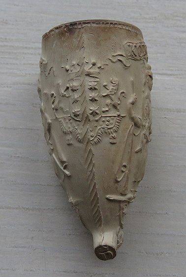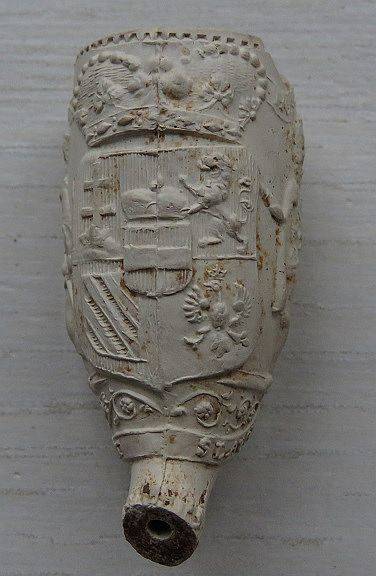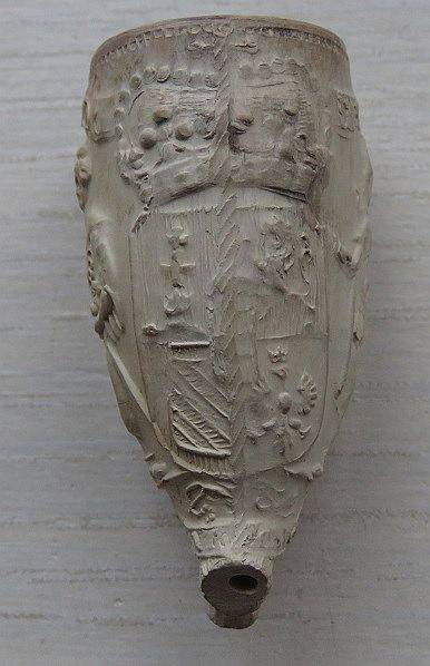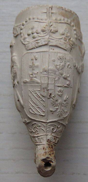 Een andere 18e eeuwse exportpijp (part verz) met de voorstelling van personen rondom wapens. Op de top van de pijp een lint met de tekst: KONINGIN VAN HONGAR. Onder op de pijp de tekst CROAAT en SLAVONIE. Pijpenmaker: Frans Verzijl. Hielmerk: leeuw in de Hollandse tuin. Ca. 1760.
