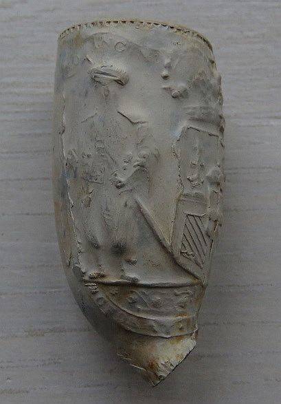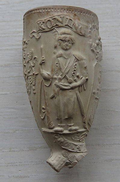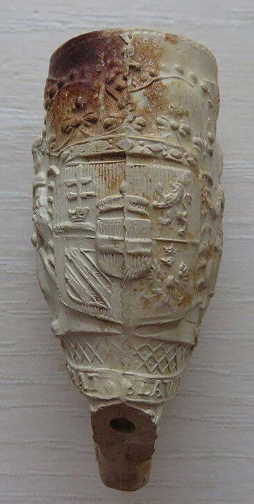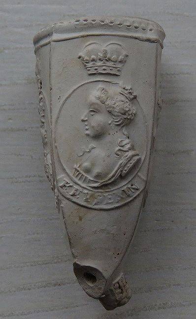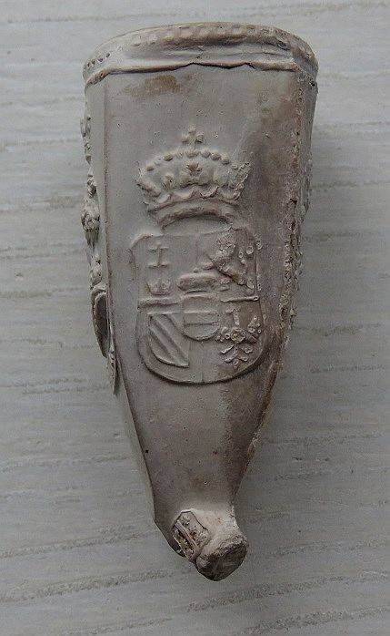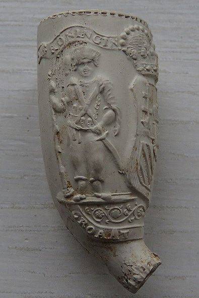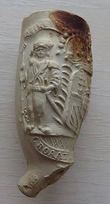 18e eeuwse kleipijp(part verz) als hierboven met wapens en personen. Ook deze pijp heeft als tekst KONINGIN VAN HONGAR. Onder op de pijp de tekst CROAAT en SLAVONIE. Goudse pijpenmaker Jan Nieuwveld. Hielmerk: fruitben. Periode 1725-1803. De mal is behoorlijk vervaagd hetgeen betekent dat deze veel gebruikt zal zijn. Bodemvondst poldergebied rondom Gouda.