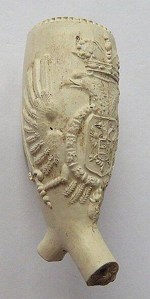 Kleipijp (lade24FM29) Ovoide. Wapen van Hongarije. Dubbelkoppige adelaar gekroond met op de borst een wapenschild met dubbelkoppige adelaar. Adelaar heeft een zwaard en scepter met lelie vast in zijn klauwen Hielmerk: Meermin. Gouda. 1747-1750.
