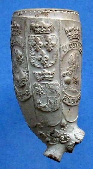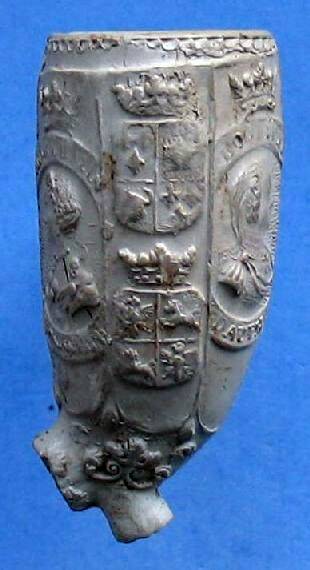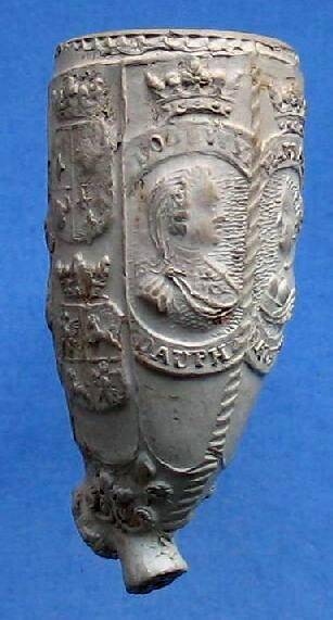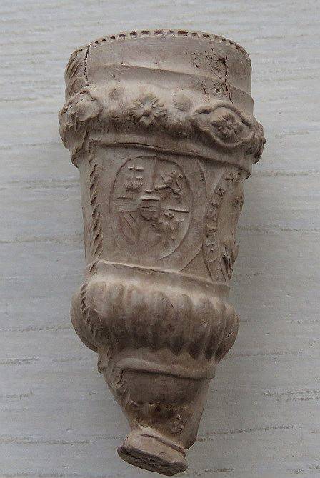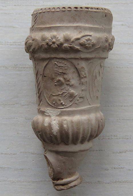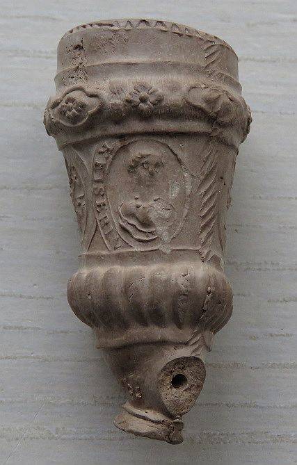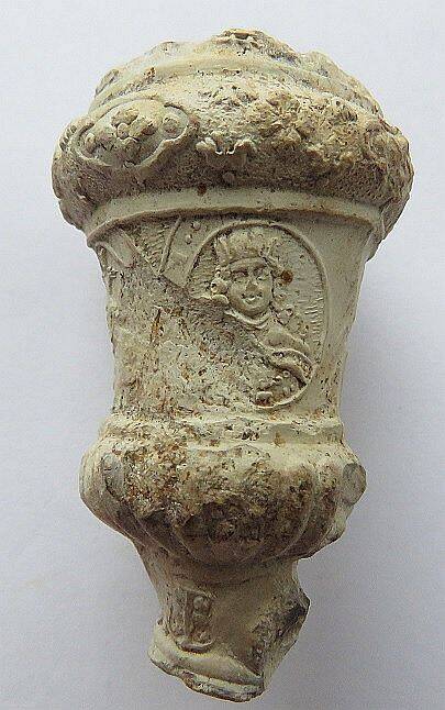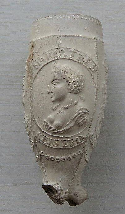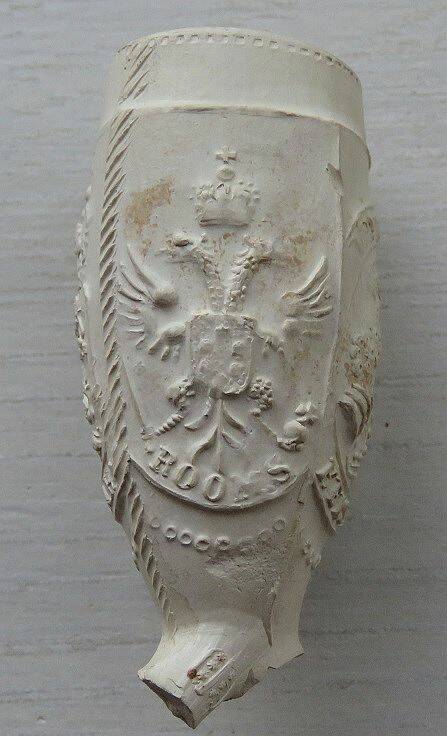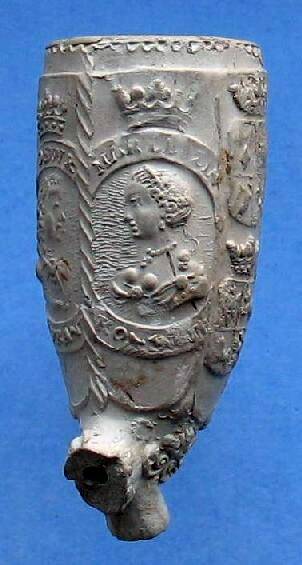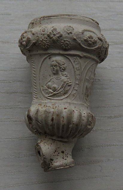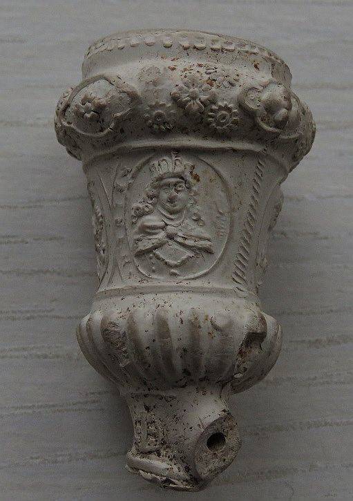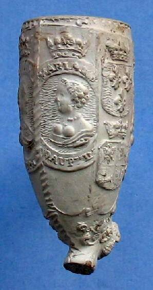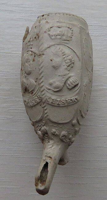 18e eeuwse kleipijp (part verz)met de portretten van KEISER Franciscus en KEISERIN Maria Theresia / Wapenschilden van Oostenrijk en Hongarije.Dit is het exemplaar met grote ketel terwijl er ook 18e eeuwse exemplaren zijn (zoals hieronder) met een kleinere ketel. Hielmerk liggende leeuw van de Goudse pijpenmaker Jacobus Swart (1748-1770). Vindplaats: poldergebied Reeuwijk.