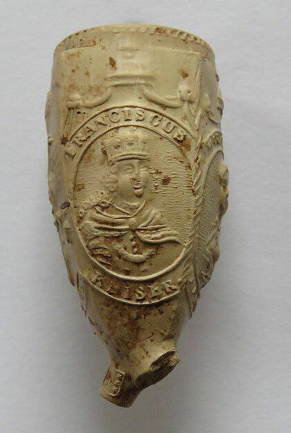 18e eeuwse kleipijp (ds30FM44) met de portretten van KEISER Franciscus en KEISERIN Maria Theresia / Wapenschilden van Oostenrijk en Hongarije. Dit is het exemplaar met kleine ketel. Hielmerk: D Goudse pijpenmaker: Jan van Leeuwen. Vindplaats Reeuwijk industrieterrein Zoutman.
