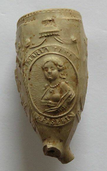 18e eeuwse kleipijp (ds30FM1178) met de portretten van KEISER Franciscus en KEISERIN Maria Theresia / Wapenschilden van Oostenrijk en Hongarije. Dit is het exemplaar met kleine ketel. Hielmerk: 73 gekroond. Goudse pijpenmaker: Arij van Houten (1725-1773).