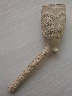 Kleipijp: ± 1748. (Part verz) Pijp gemaakt ter gelegenheid van de Vrede van Aken die in 1748 plaatsvond. Vindplaats: Gouda. Model: Ovoide zeskantig. Hielmerk: D gekroond. Pijpenmaker: Jan van Leeuwen. Versiering: Portretten van koninklijke personen.