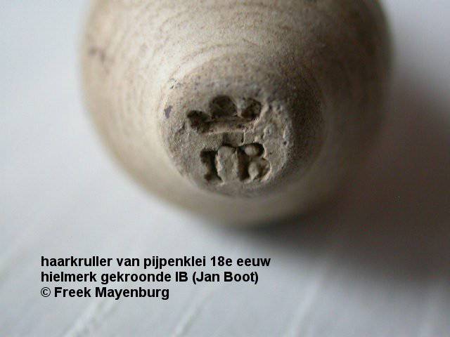 Twee haarkrullers zijn gemerkt met een hielmerkje van een Goudse pijpenmaker. Een exemplaar draagt het merk van Jan Arienz Boot, IB met een kroon erboven is afgebeeld op de linker foto. Jan Arienz Boot was een 18e eeuwse Goudse pijpenmaker die naast kleipijpen ook haarkrullers en pijpaarde beeldjes vervaardigde. Er zijn in een polder nabij Gouda zelfs pijpaarde beeldjes als stortafval gevonden waar het monogram IB op staat. Een exemplaar daarvan is onderstaand afgebeeld met een paar foto's, waarop het monogram goed is te herkennen. Bekend van hem zijn ook kleipijpen gemaakt in de vorm van een kip en een andere kleipijp die de vorm heeft van een man die voor de helft uit een bierton steekt(voor de laatste zie onder). Kleipijpen met aan twee kanten een gezicht (van een man en vrouw, waarschijnlijk koninklijke figuren), bekend als januskop, zaten ook in zijn assortiment.