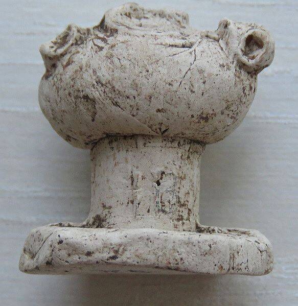 Voor- en achterzijde van een pijpaarde beeldje (Ds51FM14)met de voorstelling van een soort vaas met oren. Gemaakt door Jan Arienz Boot in de 18e eeuw. Duidelijk is op de linkerfoto het monogram IB af te lezen. Vindplaats: Reeuwijk tuinderij