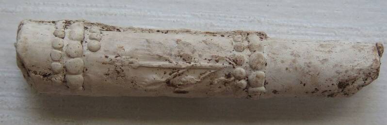 exemplaren bekend die het monogram wel hebben. Wel zijn aan weerskanten nog vagelijk te zien het Goudse bijmerk wat er op duidt dat de pijp na 1740 moet zijn gemaakt. Datering: Midden 18e eeuw. Vindplaats: Reeuwijk opspuitterrein.