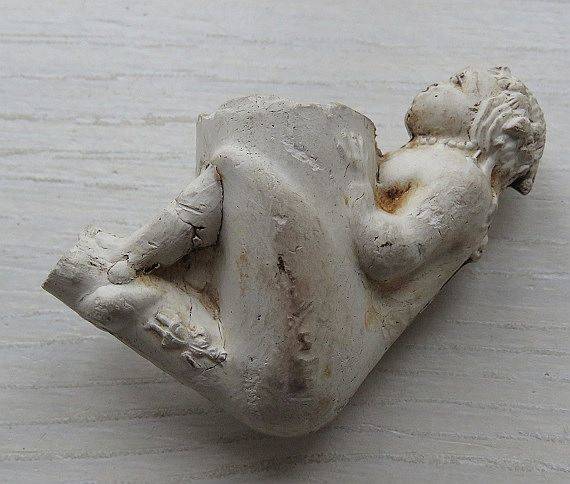 Voor- en achterzijde van een pijpaarde beeldje met de voorstelling van ornamenten. Gemaakt door Jan Boot in de 18e eeuw. Op de foto rechts staat het initiaal linksboven. Bodemvondst: Nederland. Coll. M. Kolk Amsterdam.