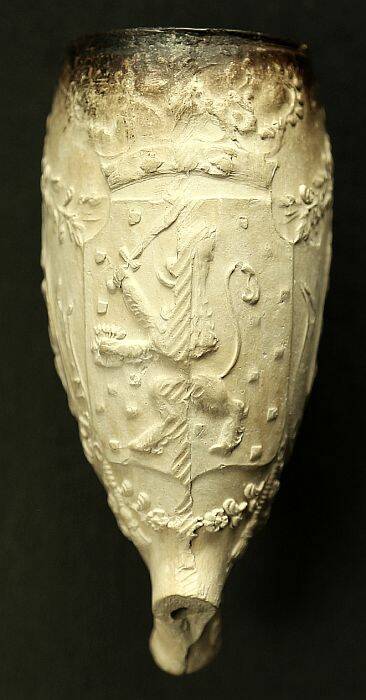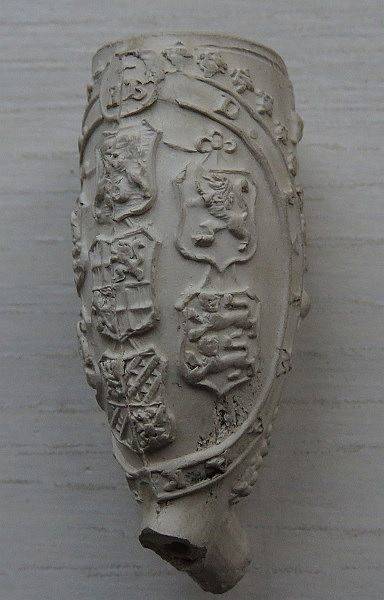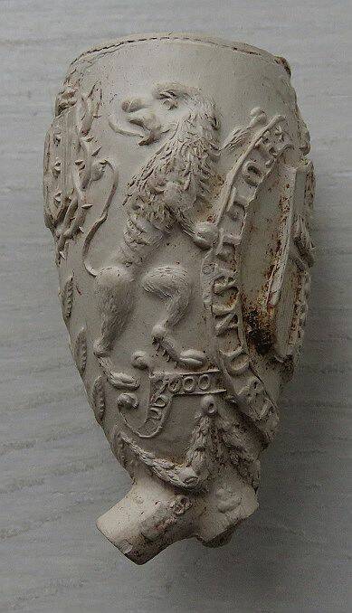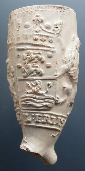 18 eeuwse Kleipijp (ds26FM1878) met leeuwen rondom een wapenschild waarop de wapens van de zeven Provinciën.
