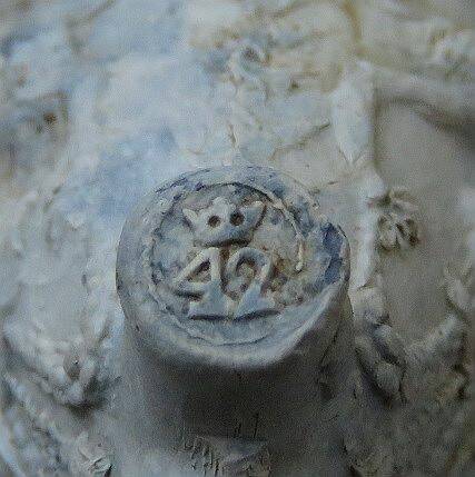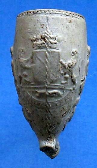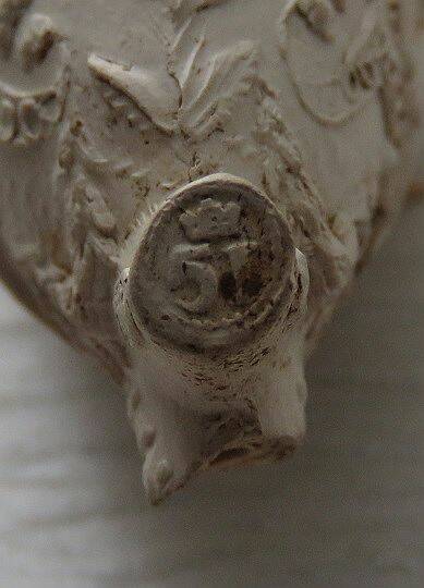 Kleipijpje (Ds33FM762) mooi bewerkt met putti's rondom twee wapenschilden. Als tekst in een lint: GRONING en LWAARD. 2e helft 18e eeuw. Hielmerk minder bekend een gekroonde wieg met kind. Vindplaats: Waddinxveen Otweg.
