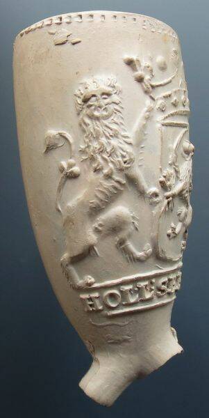 18 eeuwse Kleipijp (lade11FM) met leeuwen rondom een wapenschild waarop zes stadswapens van o.a. Amsterdam, Leiden, Haarlem, Gouda , Den Haag en Rotterdam. In een lint aan onderkant de tekst: HOLLANDIA. Hielmerk ontbreekt.