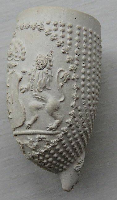 Hielmerk Leeuw in de Hollandse tuin van de Goudse pijpmaker Frans Verzijl. Bodemvondst polder Reeuwijk.
