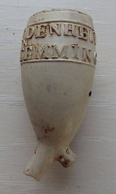 Kleipijp (PB) met Tekstlint: "EENDRAGT MAAKT MAGT". Hielmerk: 58 gekroond. Ca. 1840.