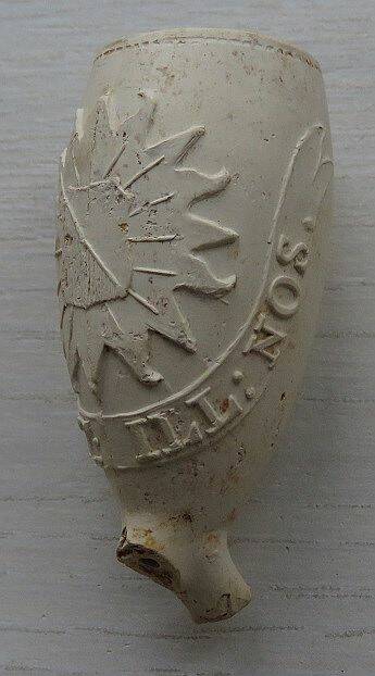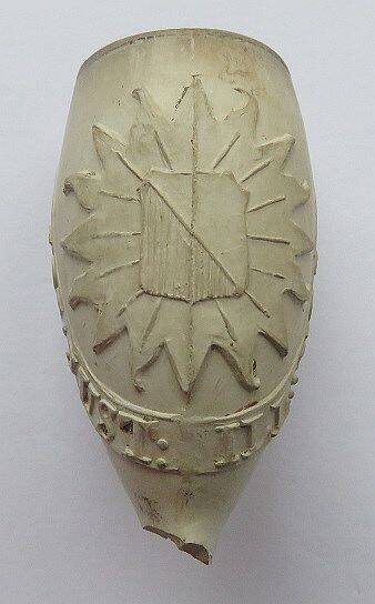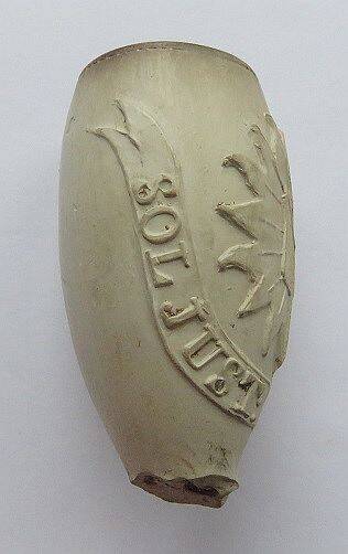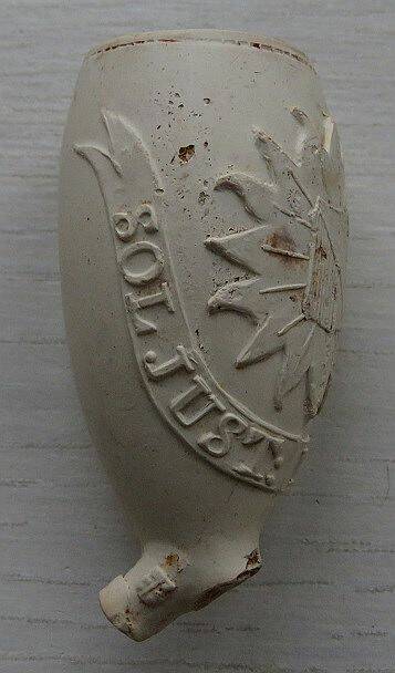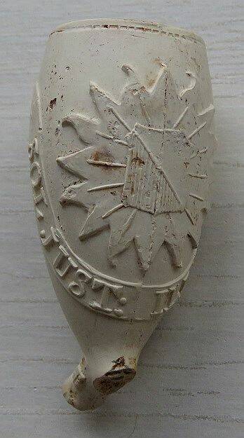 Kleipijp (Lade61FM20) Ovoide. Met aan de rokerskant een zon met het wapen van Utrecht. Tekst: SOL.JUST ILL:NOS: Het motto van de Utrechtse universiteit (SOL JUSTITIAE ILLUSTRA NOS). Hielmerk: ontbreekt. Maar zou kunnen zijn: Wapen Leiden. 1886. Pijpenmaker: P. Goedewaagen & Zoon. Vindplaats: Uit de antiekhandel