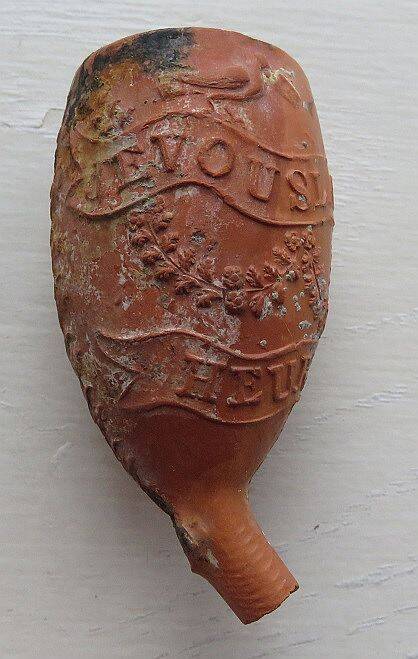 Kleipijp (lade23FM272) Kleipijp met in een lint een Franse tekst rondom de ketel. JE VOUS LA SOUHAITE (Ik wens je) en de tekst HEUREUSE (geluk). Zonder vogeltjes. Datering: 1870-1920. Hielmerk: WS gekroond