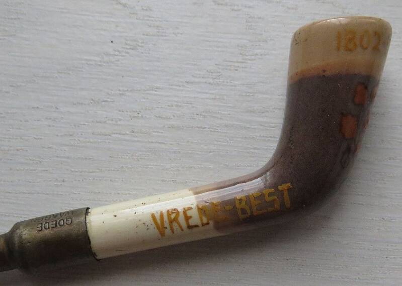 Kleipijp (Lade19FM09RS) met handgeschilderd pijpje. Op de steel de tekst: SOCIETEIT VREDE-BEST en op de ketel 1802 30APRIL1927.