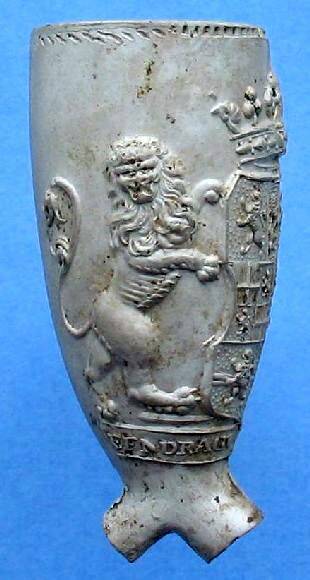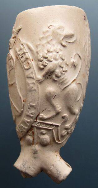 Kleipijp (part verz) met leeuwen vastgehouden wapenschild met de wapens van de zeven provinciën. Tekst: "EENDRAGT MAAKT MAGT".