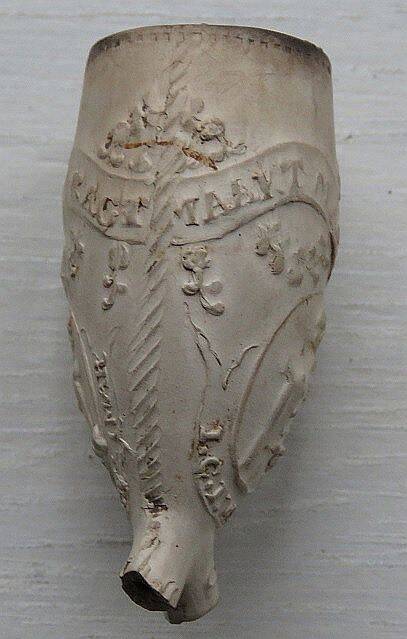 Kleipijp (PB) met Tekstlint: "EENDRAGT MAAKT MAGT". Hielmerk: 58 gekroond. Ca. 1840.