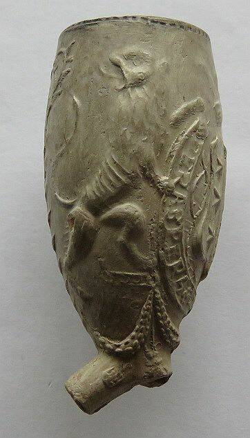 Kleipijp (AK) met Wapen van Gouda vastgehouden door twee staande leeuwen met afgewende kop. PER ASPERA AD ASTRA.