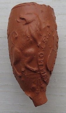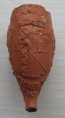 Kleipijp (Ds28FM451) met een wapenschild met kroon erboven vastgehouden door twee leeuwen met afgekeerde kop.