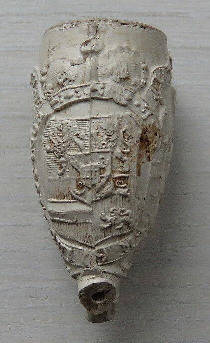 Kleipijp (CvM) met leeuwen rondom een wapenschild. Rondom de wapen de tekst HONI SOIT QUI MAL Y PENSE.