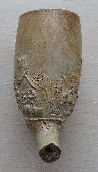 Fraaie kleipijp (Lade20FM513) met een voorstelling van schaatsende mensen, koek en zopie tent in een landschap met op de achtergrond een stellingmolen. Tekst: VAN T NOORDEN. Ca. 1880-1900. Gouda. Pijpenmaker: onbekend.