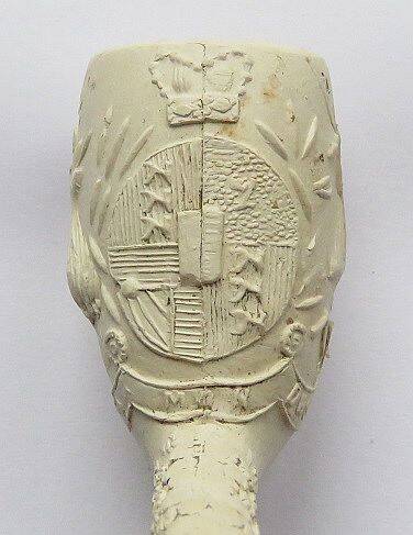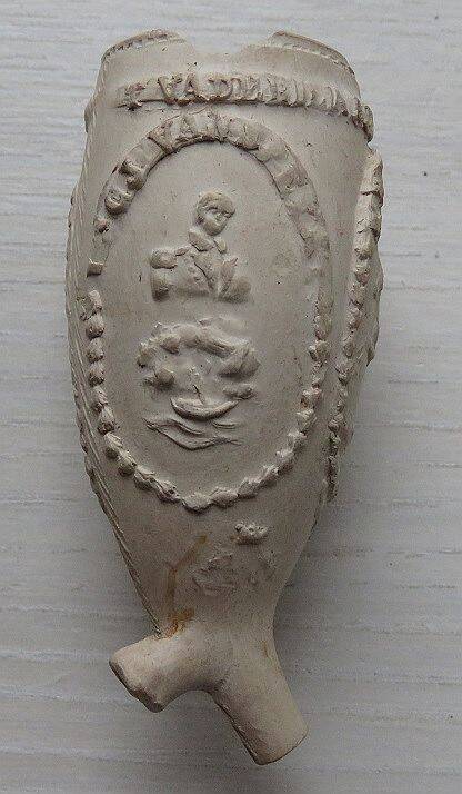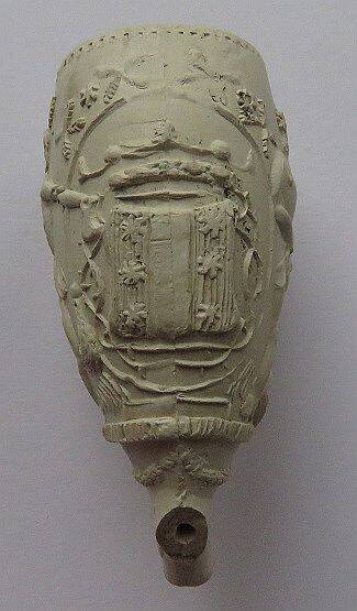 De gravering van de voorstelling op deze kleipijp is wel erg onbeholpen en simpel uitgevoerd. Overigens is deze pijp w.s.
